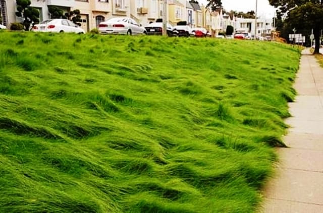 Existe una opción en la que evitaríamos el engorro de cortar un césped en pendiente y reducir riegos y abonados a solo en épocas de necesidad extrema. Y es el uso de las Festucas finas. Esta especie además de su resistencia y finura proverbial, tiene la característica de que en crecimiento descontrolado, desarrolla unas formas altamente estéticas.