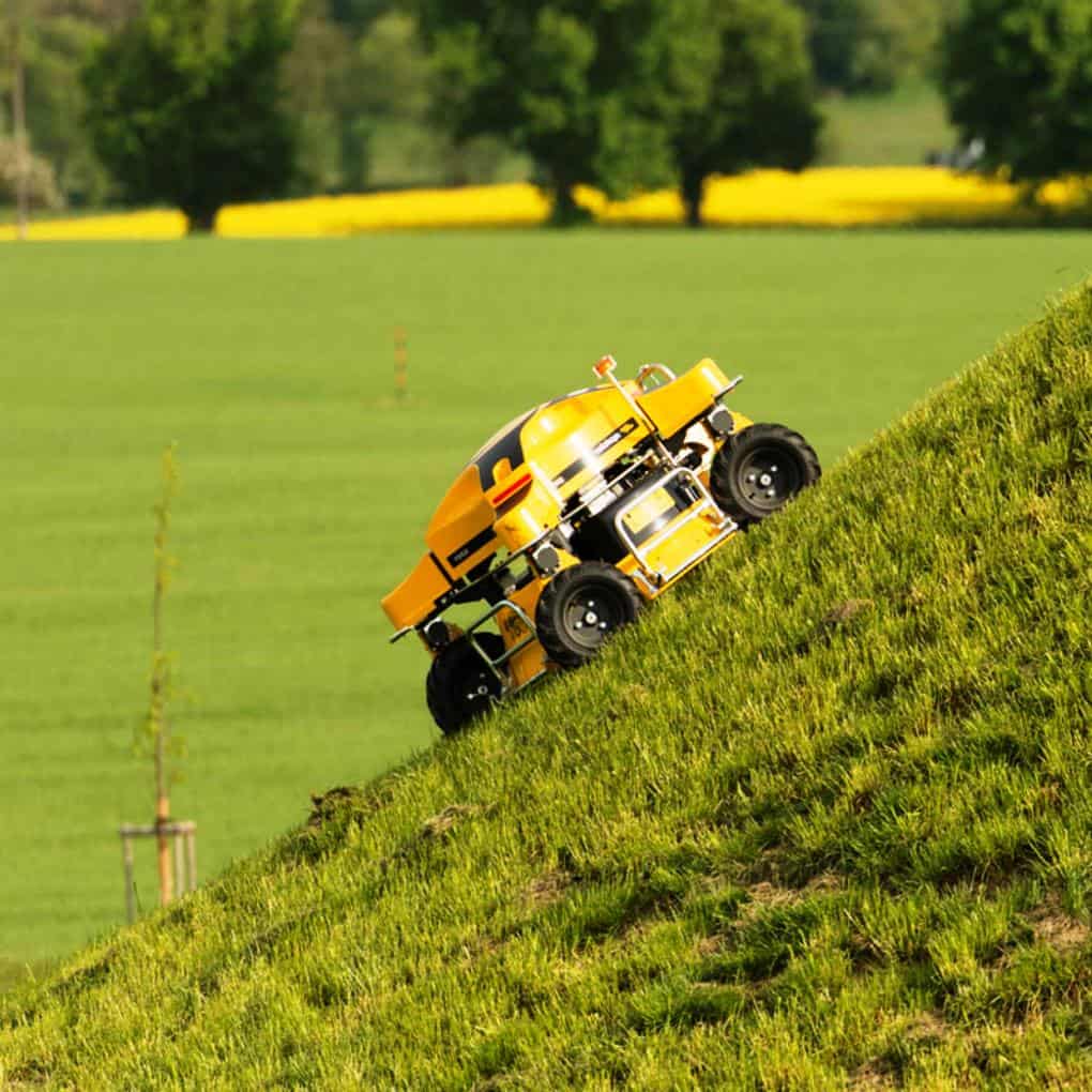 Siega: Las siegas en pendiente, aunque esta sea moderada, siempre son complicadas y costosas. Utilizando un cortacésped tradicional, procurar hacerlo en diagonal. Podemos usar segadoras flotantes y descolgarlas por la pendiente y siempre nos quedan las desbrozadoras de hilo. Los robots convencionales también trabajaran bien en pendientes suaves.