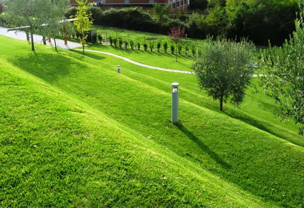 Aquí trataremos sobre el césped en taludes y pendientes pronunciadas, así que hablaremos de zonas ajardinadas y de superficies generalmente limitadas, tanto en parques públicos como en jardines privados. Otro concepto y tratamiento que cuando hablamos de revegetación de taludes en espacios naturales (VER).