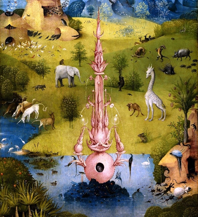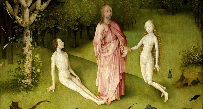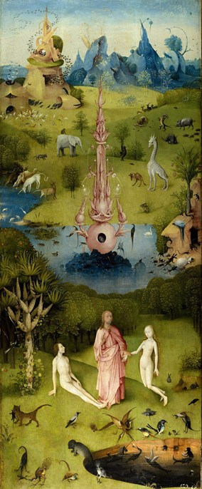Centrándonos en El Jardín de las Delicias, se trata de un tríptico fechado hacia 1.505, que se lee de izquierda a derecha. En el panel izquierdo se representa el Paraíso, con Adán y Eva cuya unión es bendecida por Dios creador. El panel central es una continuación del paraíso. Pero se trata de un paraíso aparente, lleno de sensualidad y de imágenes sorprendentes cargadas de lujuria. El mundo real, cargado de placeres banales y aparentes.