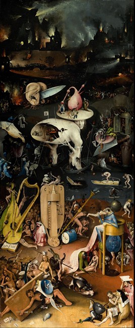 Por fin la tabla de la derecha representa el infierno, con figuras inquietantes y escenas dramáticas, en un entorno tenebroso.
