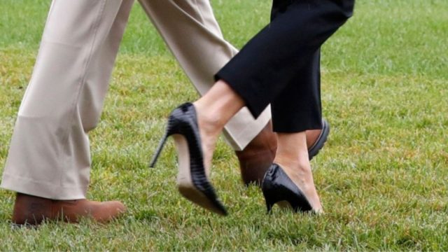 La ex Primera Dama Melania Trump pasea por el césped de South Lawn, con tacones de aguja, camino del helicóptero presidencial.