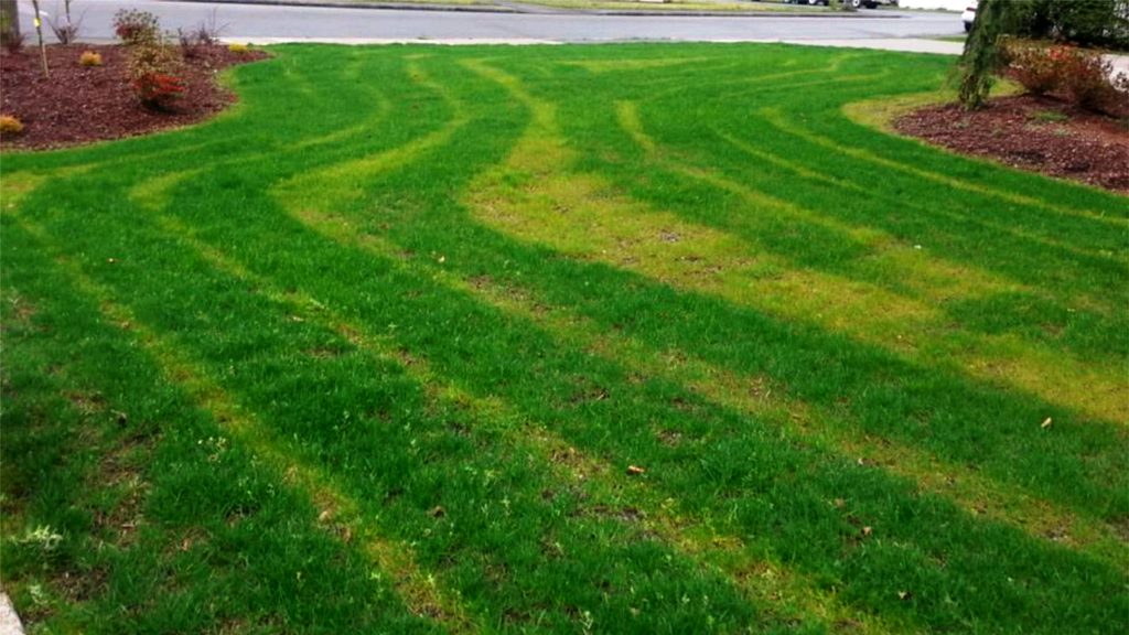 - Rayas amarillas con deficiencia de nutrientes pueden ocurrir en áreas de zonas sin fertilizantes.