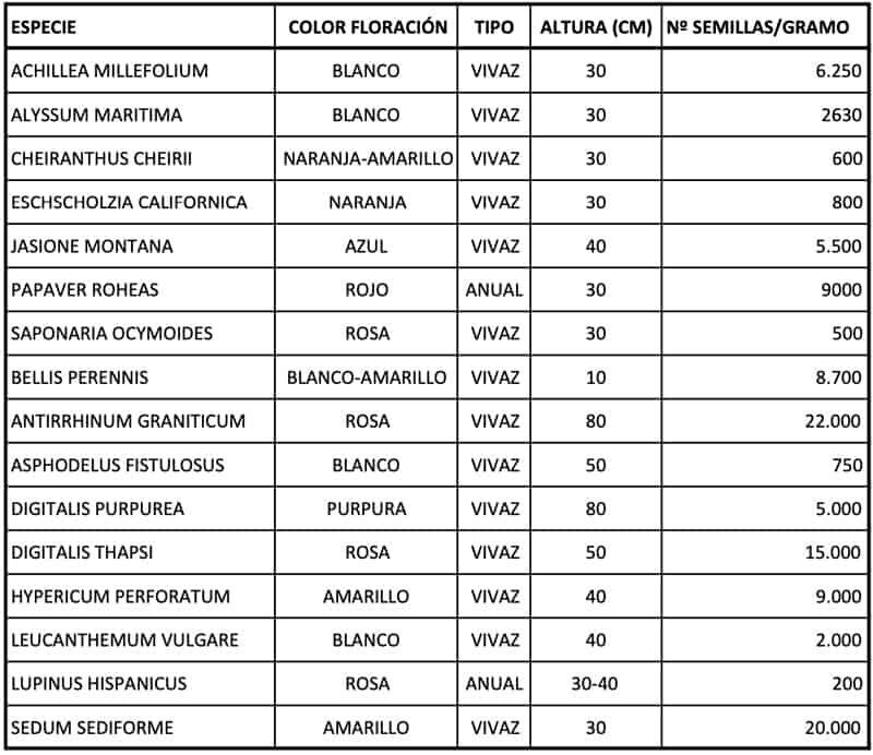 | ESPECIE | COLOR FLORACIÓN | TIPO | % |