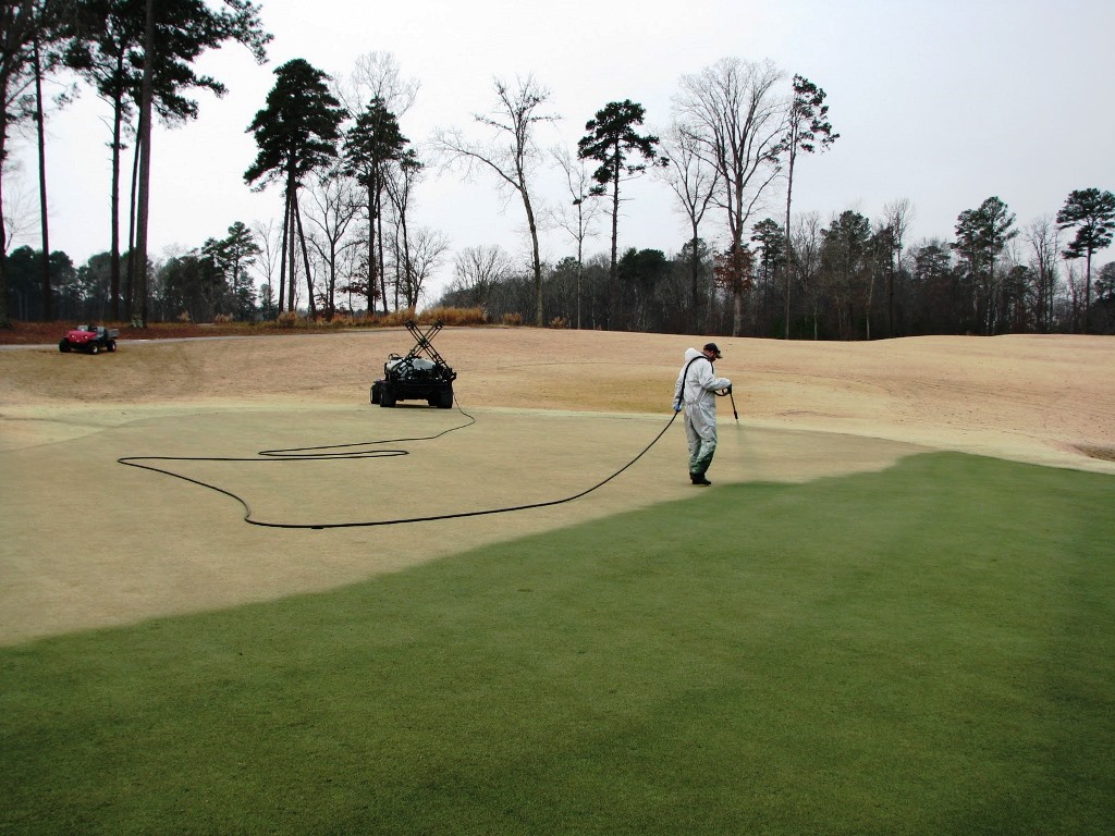 Una alternativa al overseeding en el césped de Bermuda es la aplicación de una pintura verde a la superficie, tiene algunas ventajas tanto para el golfista, como para las plantas del césped.