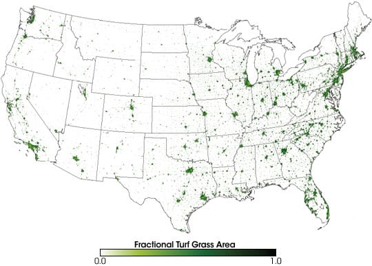 Cuando por fin hicieron las estimaciones dijo Milesi: “Incluso de manera conservadora, yo estimo que hay tres veces más acres de césped en los EE.UU. que el maíz de regadío.” Esto significa césped, incluyendo céspedes residenciales y comerciales, campos de golf, etc.-se podrían considerar el mayor cultivo de riego en Estados Unidos en términos de superficie, que abarca 128.000 kilómetros cuadrados en total”.