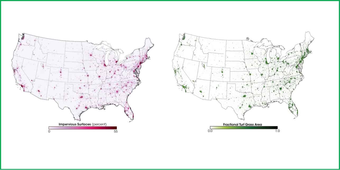 No fue fácil determinar vía fotografías de satélites, la superficie de césped, ya que los satélites con alta resolución eran prohibitivos para este trabajo, pero descubrieron una relación entre las superficies impermeables, las zonas iluminadas y las áreas de césped y crearon un algoritmo con estos vectores.